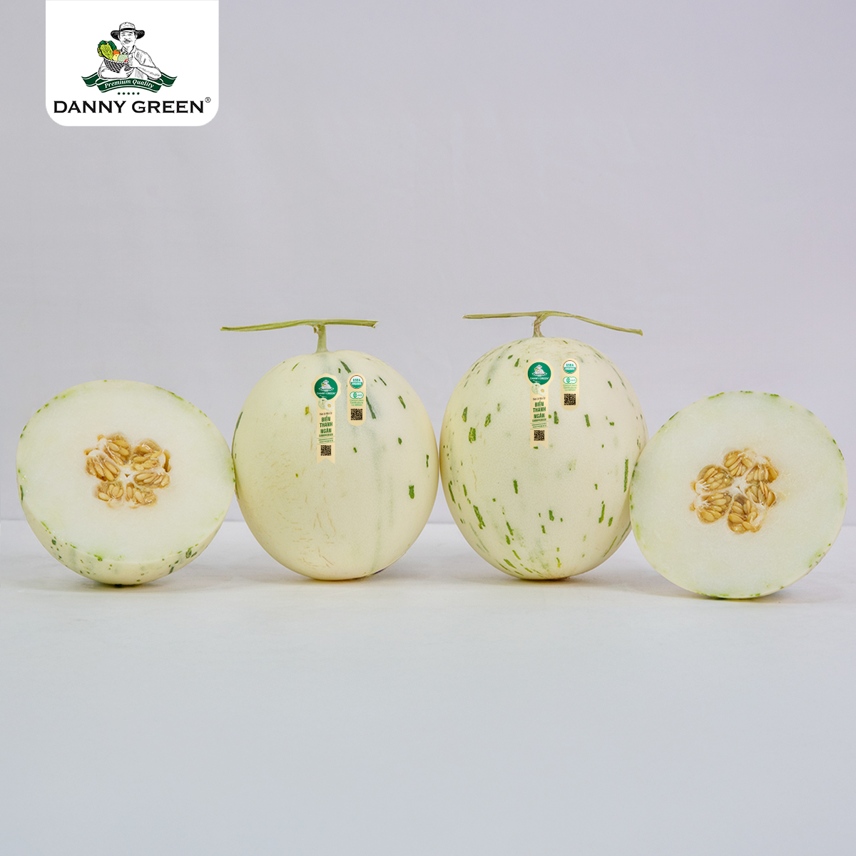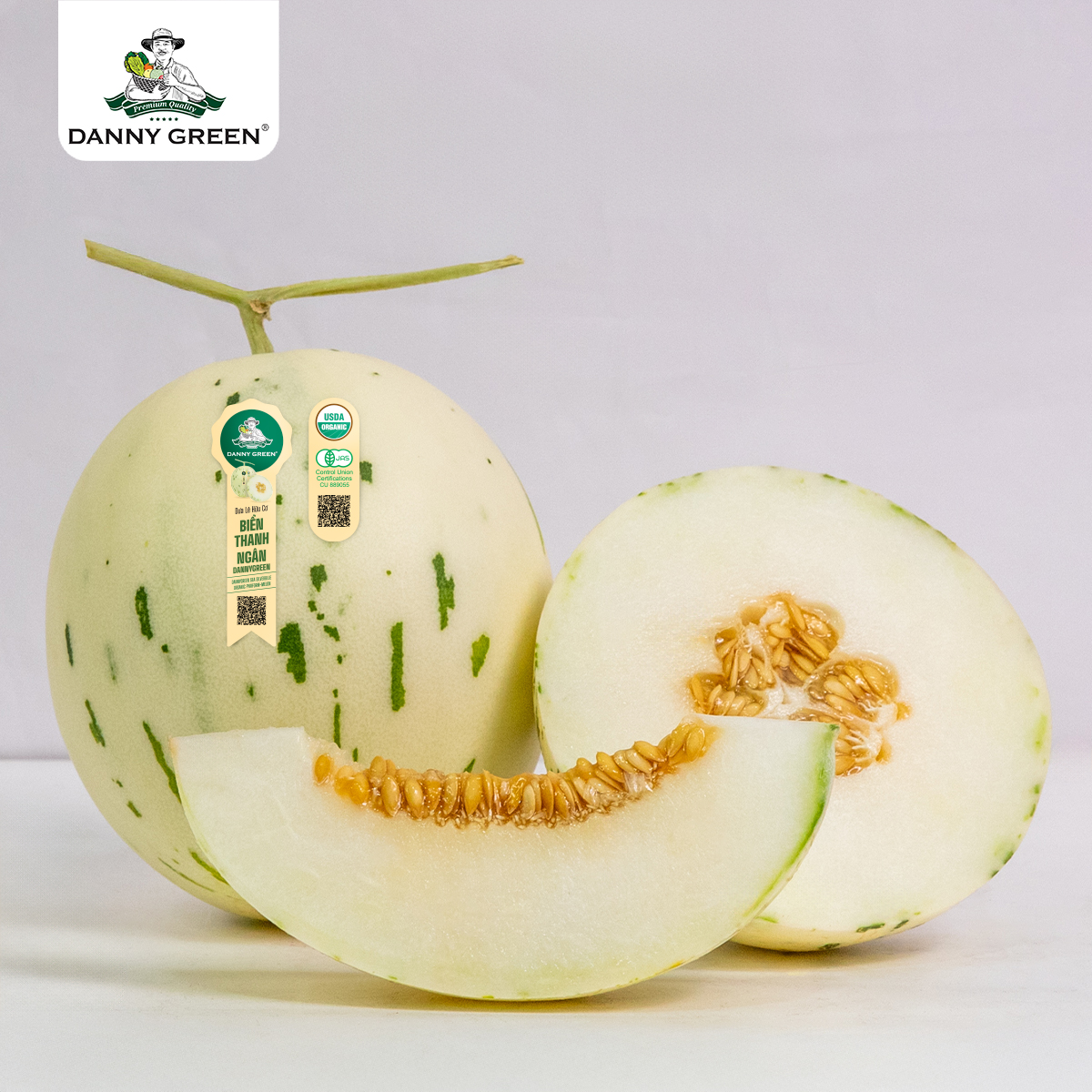 Dưa Lê Hữu Cơ Biển Thanh Ngân DannyGreen được trồng và canh tác theo phương thức hữu cơ công nghệ cao tại Nông Trại Hữu Cơ DannyGreen, Việt Nam.