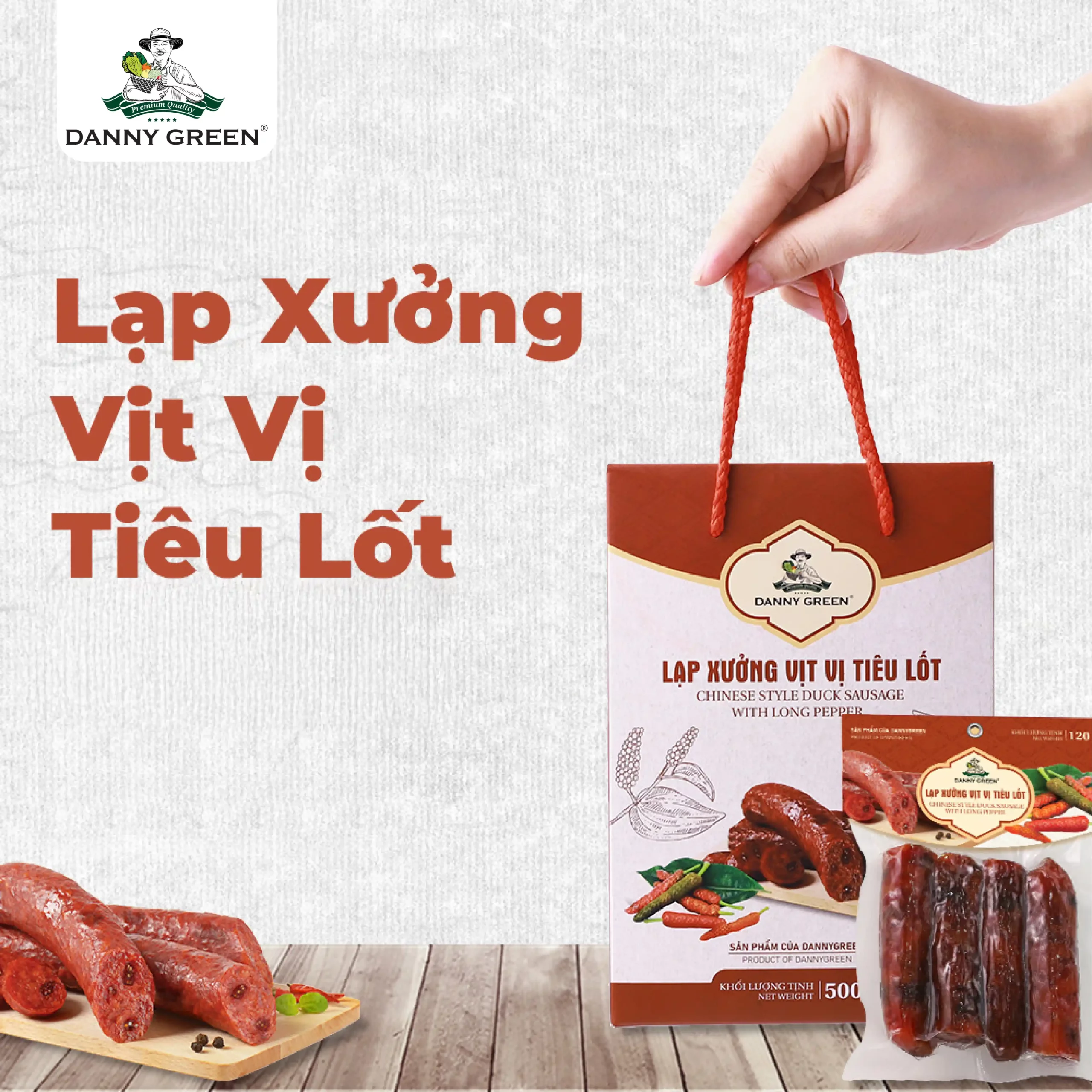 Lạp Xưởng Vịt Vị Tiêu Lốt DannyGreen là sự hoà quyện hoàn hảo giữa các loại gia vị đặc trưng, nổi bật với vị cay thơm nồng của tiêu lốt. Sản phẩm được chế biến từ thịt vịt, thịt heo cùng mỡ heo béo bùi, tạo nên hương vị đậm đà, đặc sắc. Công thức gia truyền kết hợp với rượu mai quế lộ giúp giữ trọn vẹn mùi thơm tự nhiên, mang đến món lạp xưởng hấp dẫn và khác biệt.