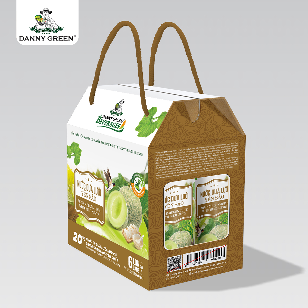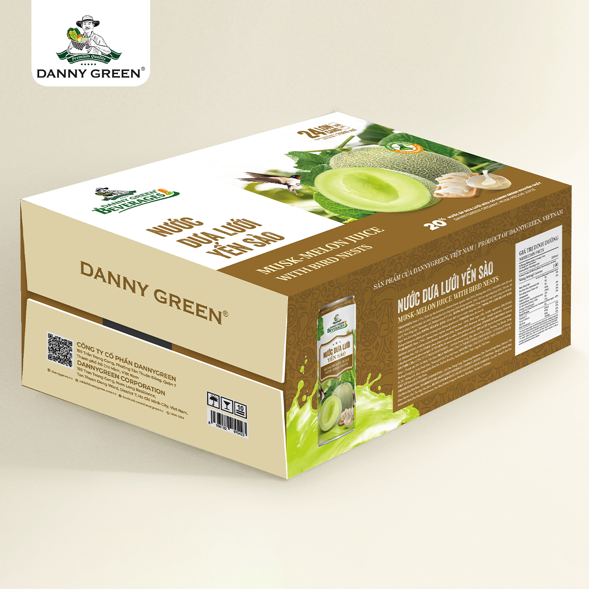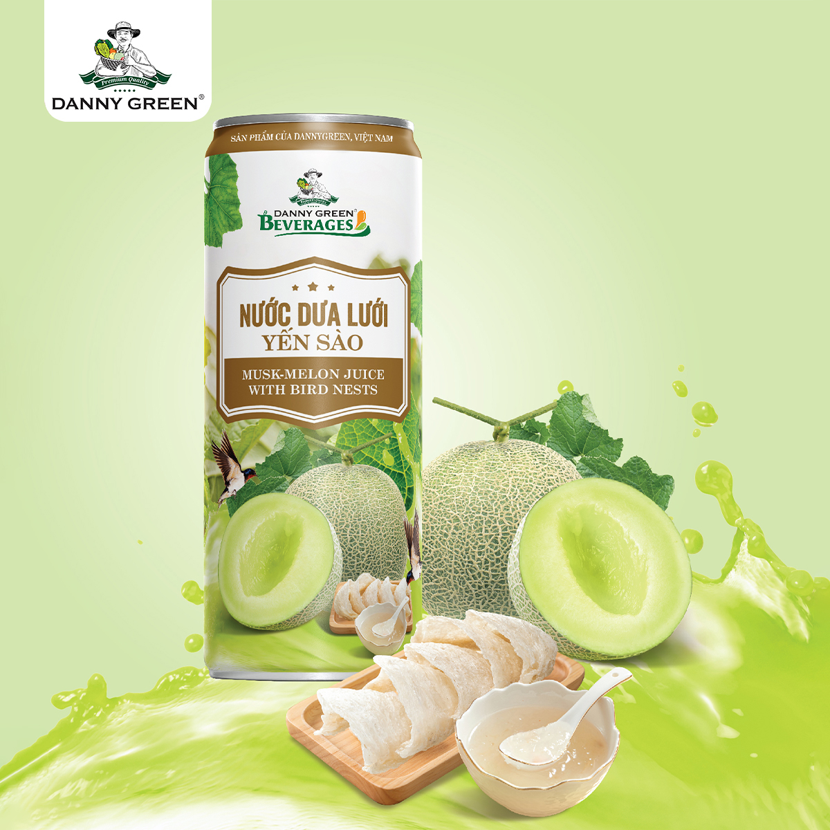 Nước Dưa Lưới Yến Sào DannyGreen là dòng sản phẩm nước giải khát với 20% nước ép Dưa Lưới Hữu Cơ DannyGreen nguyên chất, kết hợp với Yến Sào và không sử dụng chất bảo quản.