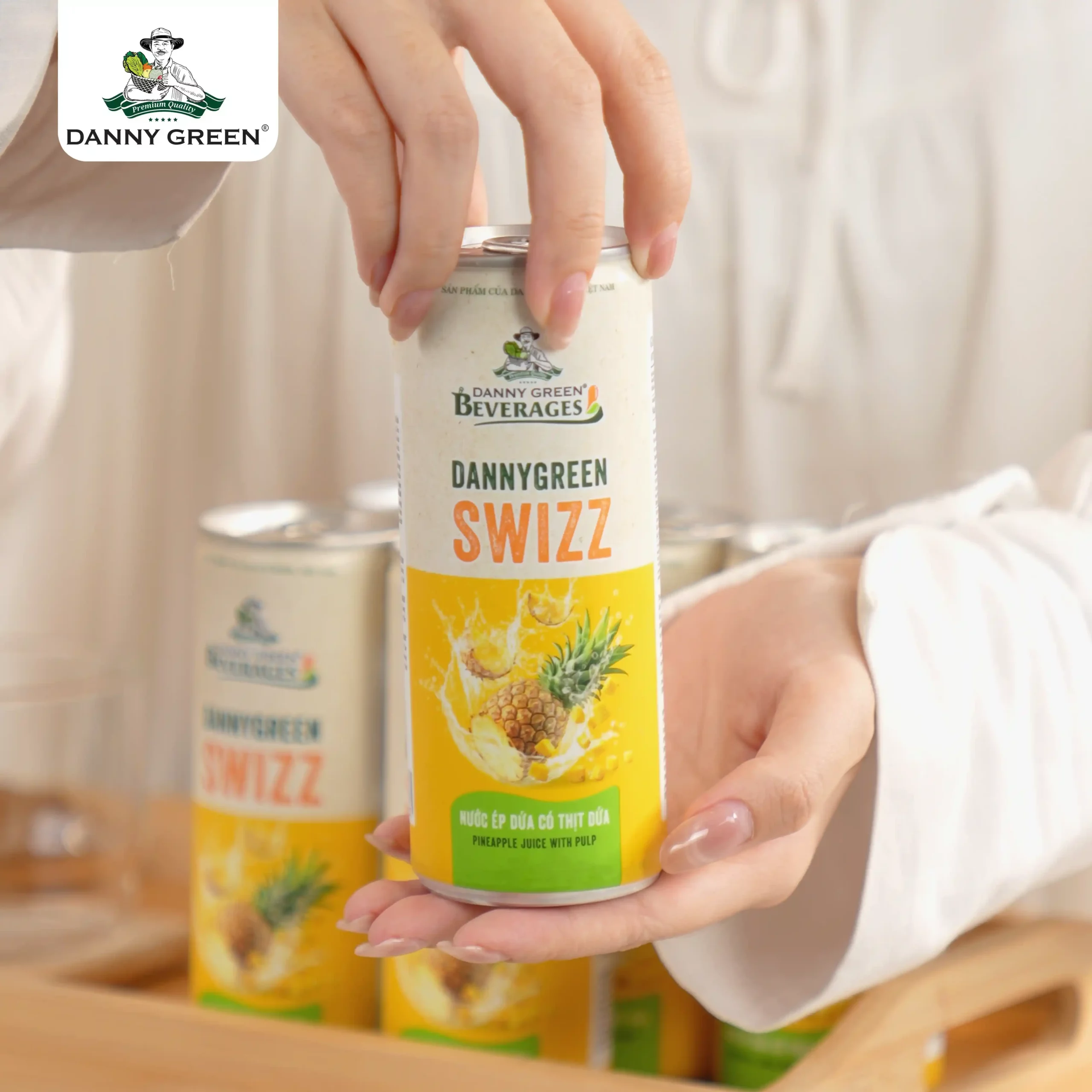 Nước Ép Dứa Có Thịt Dứa DannyGreen Swizz là dòng sản phẩm nước giải khát với 70% là nước ép dứa tươi nguyên chất cùng thịt dứa, theo công thức độc quyền từ DannyGreen